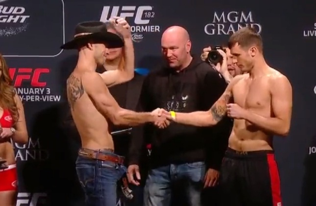 Virados cada um para uma direção, com Jones de frente para as câmeras e Cormier de costas para o público, a dupla sequer deu trabalho para o presidente Dana White, que tratou logo de se enfiar no meio dos rivais a fim de evitar qualquer ataque que pudesse acontecer.Antes disso, porém, Daniel Cormier já entrou no palco provocando o campeão, com uma camisa em que se lia “Break Bones” (“Quebre os ossos”, em alusão ao apelido de Jones). Na balança, o desafiante não teve problemas e cravou os 93 kg limites da categoria.Já Jones adotou uma postura diferente. Brincando com o público e oferecendo brindes de seu novo patrocinador, o mesmo do UFC, o campeão não teve pressa pra subir no palco. Jones também cravou os 93 kg limites da categoria e confirmou o duelo.Neste sábado (03), a dupla põe um ponto final em sua rixa dentro do octógono, quando duelam pelo cinturão dos meio-pesados na luta principal do UFC 182.
